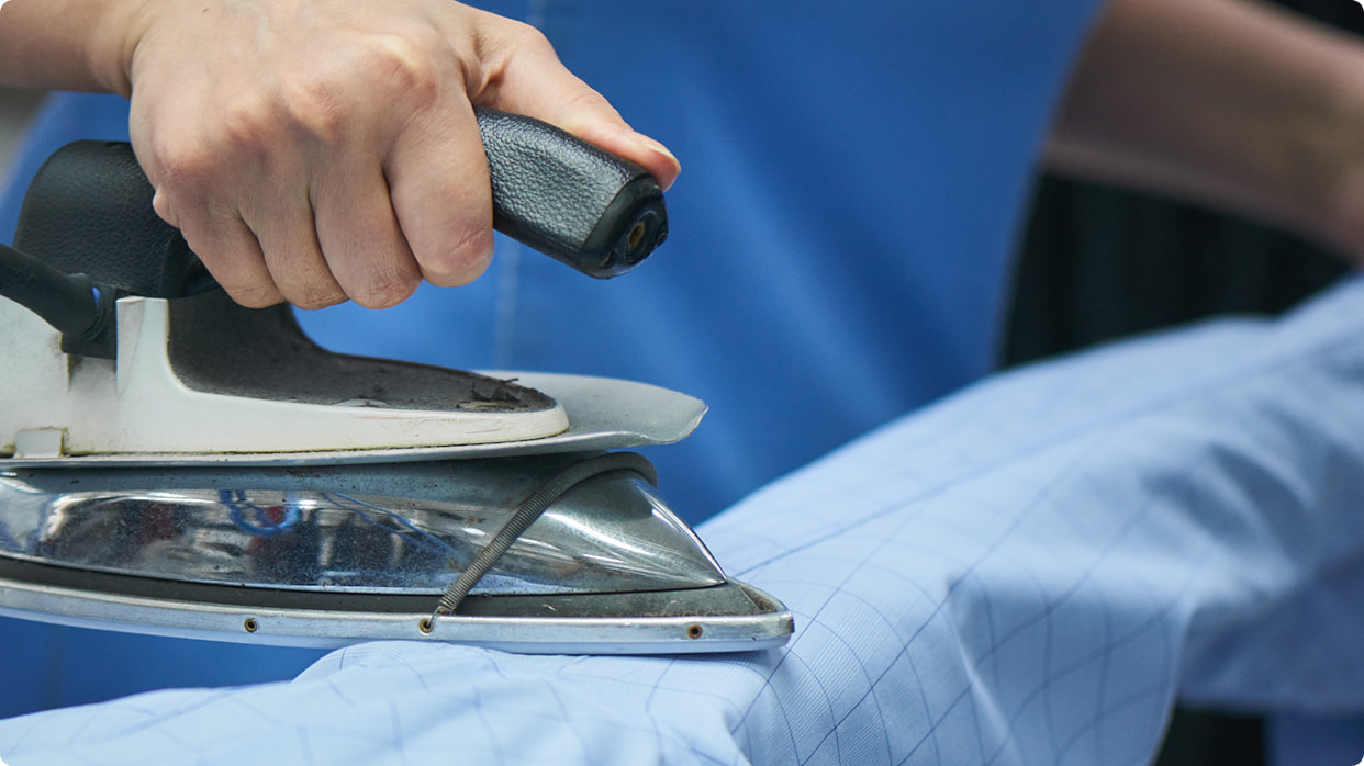 衣類にあった専用の機械やアイロンを使用して仕上げます。表地の主要部はシワ等の仕上がりチェックを行います。