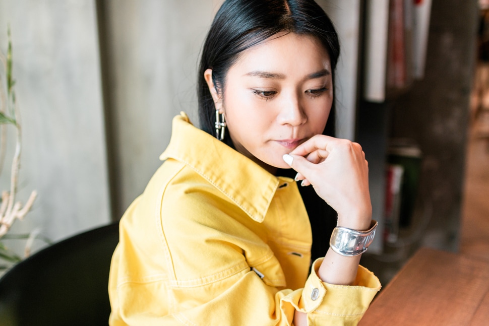 この日は洋服の金具に合わせて、アクセサリーもシルバーでまとめているそう