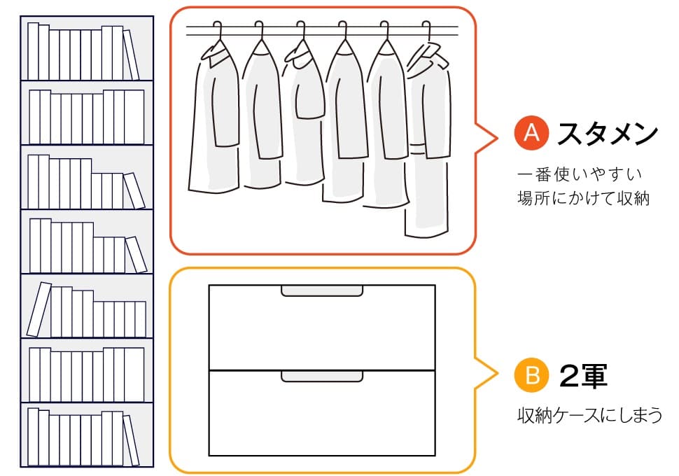 分類したら「スタメン」はクローゼットの一番使いやすい場所にかけて収納。今の気分ではない「B:二軍」のお洋服は、収納ケースにしまっていきます。「C:いらないもの」はフリマアプリに出品するため、別の場所に保管しておきましょう。